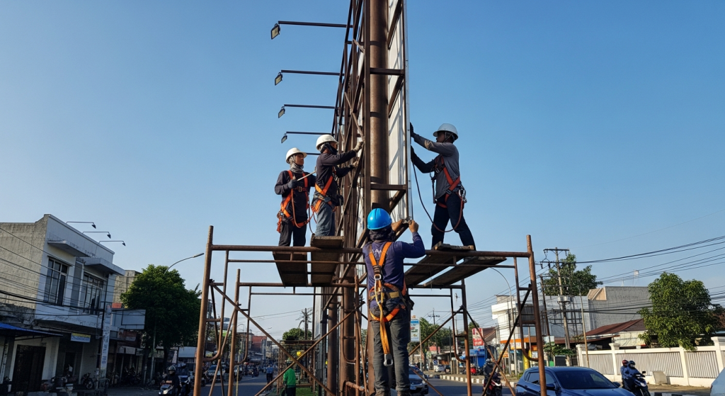 Harga jasa pasang dan bongkar billboard tergantung ukuran, lokasi, serta tingkat kesulitan pekerjaan.